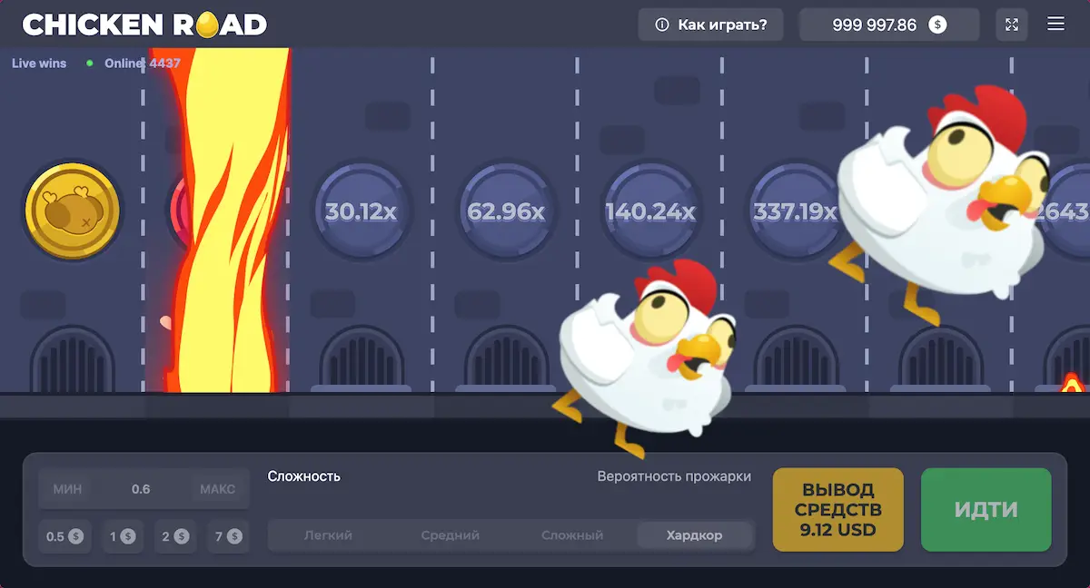 Нажмите кнопку "Старт" или "Играть". Курица начнёт переходить через дорогу, а множитель будет расти с каждым успешным шагом. На экране вы увидите текущий коэффициент выигрыша в реальном времени.